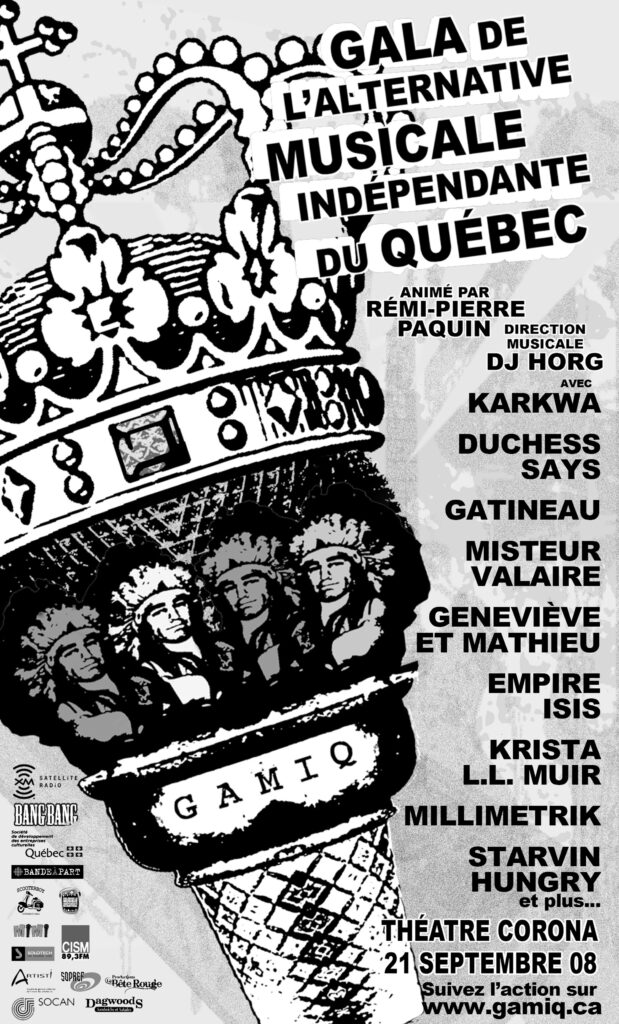 GAMIQ – NOMINATIONS 2008 Artiste de l’année Gatineau Ghislain Poirier Karkwa Plants and Animals We Are Wolves Révélation Alexandre Désilets Bonjour Brumaire Chocolat Misteur Valaire Pas Chic Chic Auteur-compositeur de l’année Chocolat Dany Placard Karkwa […]